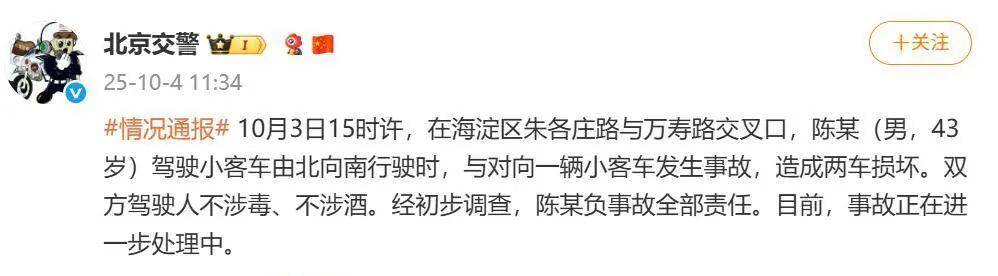 2025年10月3日下午,有网友曝光照片,称车检员陈真遭遇交通事故。北京市交管部门10月4日通报,事故当事人有酗酒、吸毒行为,陈某已对事故和解。此前报道后,陈真在社交平台发文致歉,称“这是我的问题,所有负面报道都会接受,我会全力配合解决问题,不离开。该事件以官方公告和车辆EDR数据为准。”他还表示,将全力配合相关部门做好后续工作,并赔偿对方相关损失。十月18日,陈阵接受《法治日报》采访,首次还原事故经过。他表示,事发时,他过于依赖车辆的辅助驾驶功能,在驾驶时低头拾取物品,导致事故发生。他依法对事故承担全部责任,并向受害方致歉。同时,他提醒公众,在使用辅助驾驶之前,应充分了解所驾驶车辆“智能驾驶”能力的极限,谨慎驾驶,切勿盲目相信系统。展开全文
